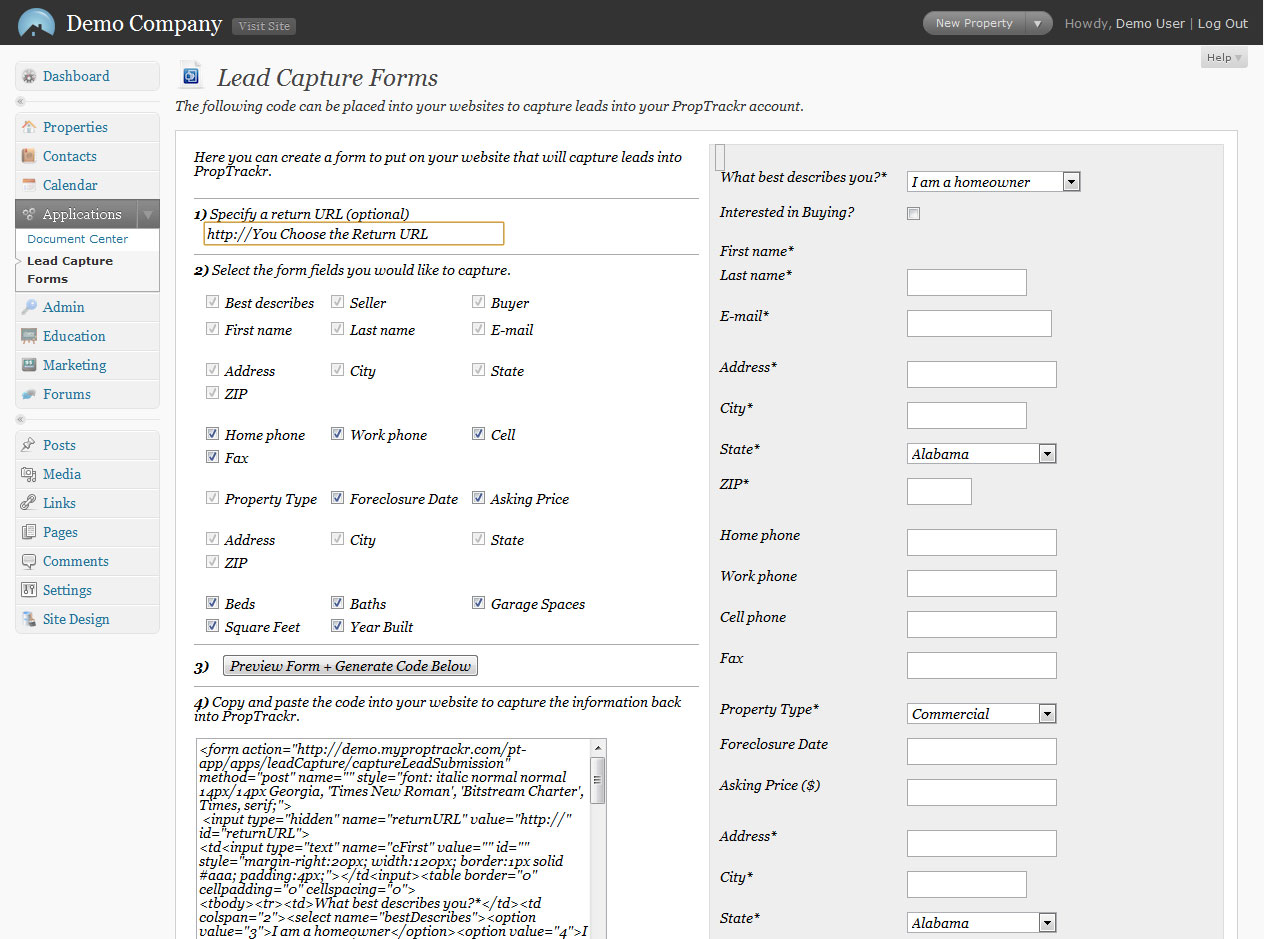 PropTrackr Lead Capture Forms allows you to generate a customizable form for you to place on any site that allows custom HTML. Generate simple to complex forms detailing all the information a potential buyer or seller is looking for. By clicking just a few check boxes, PropTrackr lead capture forms allow you to display a submission form requesting things like name, e-mail address, contact information, number of bedrooms, square footage, property type, garage space, asking price, etc. PropTrackr Lead Capture Form allows you to customize a return URL or web address as an extra feature. This allows you to target your audience and return them to a customized page just for them. The leads generated from your Lead Capture Forms will go right into your PropTrackr account and you’ll also be notified via e-mail.