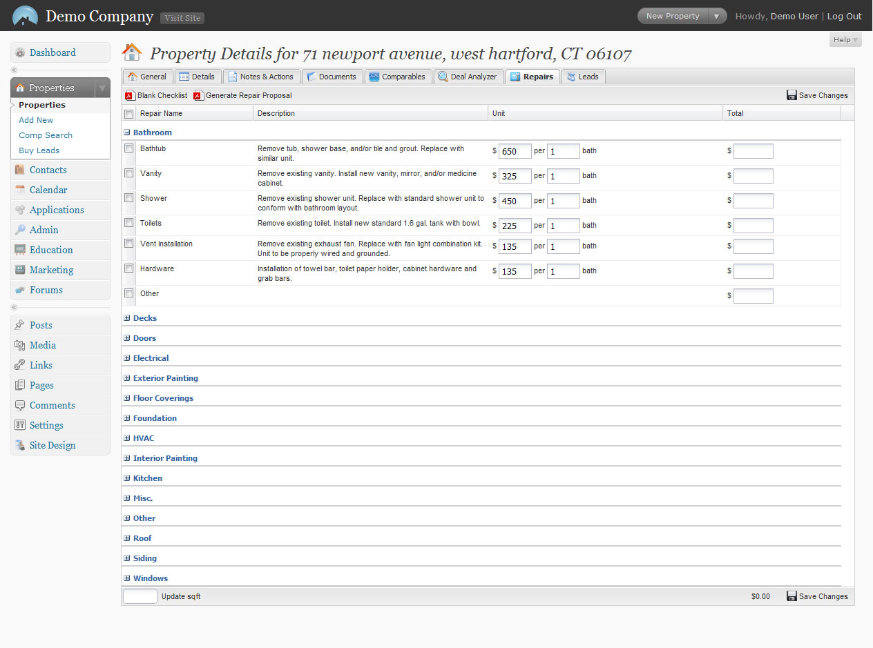 You just purchased a property and now you’re ready to start improving the property and getting ready to flip it for a profit. But first there is a lot of work to be done. The bathrooms need to be upgraded, electrical needs to be rewired and the property needs a new roof along with the interior upgrade needs. Well what’s that going to cost? Using the PropTrackr Repair Estimator, allows you to see the estimated costs before the project starts and generates proposal reports for contractors to bid on. PropTrackr Repair Estimator has over a dozen possible categories to choose from, helping evaluate the cost of repairs before you even start. You can even add your own custom repairs.